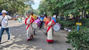 এরপর ইন্ডিয়া ট্যুরিজমের অফিস থেকে পায়ে হেঁটে স্কুলের ছাত্র-ছাত্রী সহ সকলে পরিবেশ বাঁচানোর অঙ্গীকার নিয়ে রওনা হয় ভিক্টোরিয়া মেমোরিয়ালের উদ্দেশে। এই যাত্রায় উল্লেখযোগ্য দিক ছিল – মহিলা ঢাকিদের উপস্থিতি। একেবারে পুরোভাগে দুইজন মহিলা ঢাকি শারোদৎসবের মুহূর্তকে আরও উজ্জ্বল করে তোলেন। এটিএসপিবি-র পক্ষ থেকে সকলকে এদিন তাদের এবং ইন্ডিয়া ট্যুরিজমের লোগো লাগানো সাদা রঙের টুপি দেওয়া হয়।